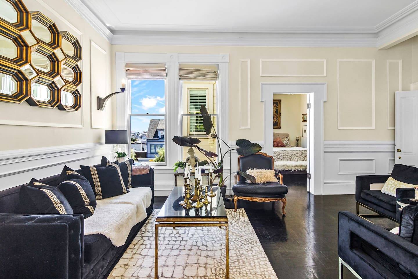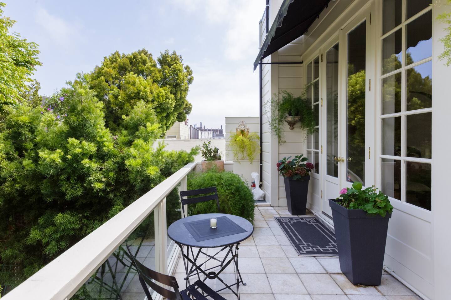 Soak up the charm of this remodeled vintage-modern apartment with a balcony overlooking a lush garden. High ceilings, ebony floors, and a beautiful bathroom give it magazine-worthy appeal. Located in upscale Pacific Heights, this top-floor one-bedroom is all yours. Maximum two guests. The sofa is for lounging only, not for sleeping. Close to great shops and eateries.
