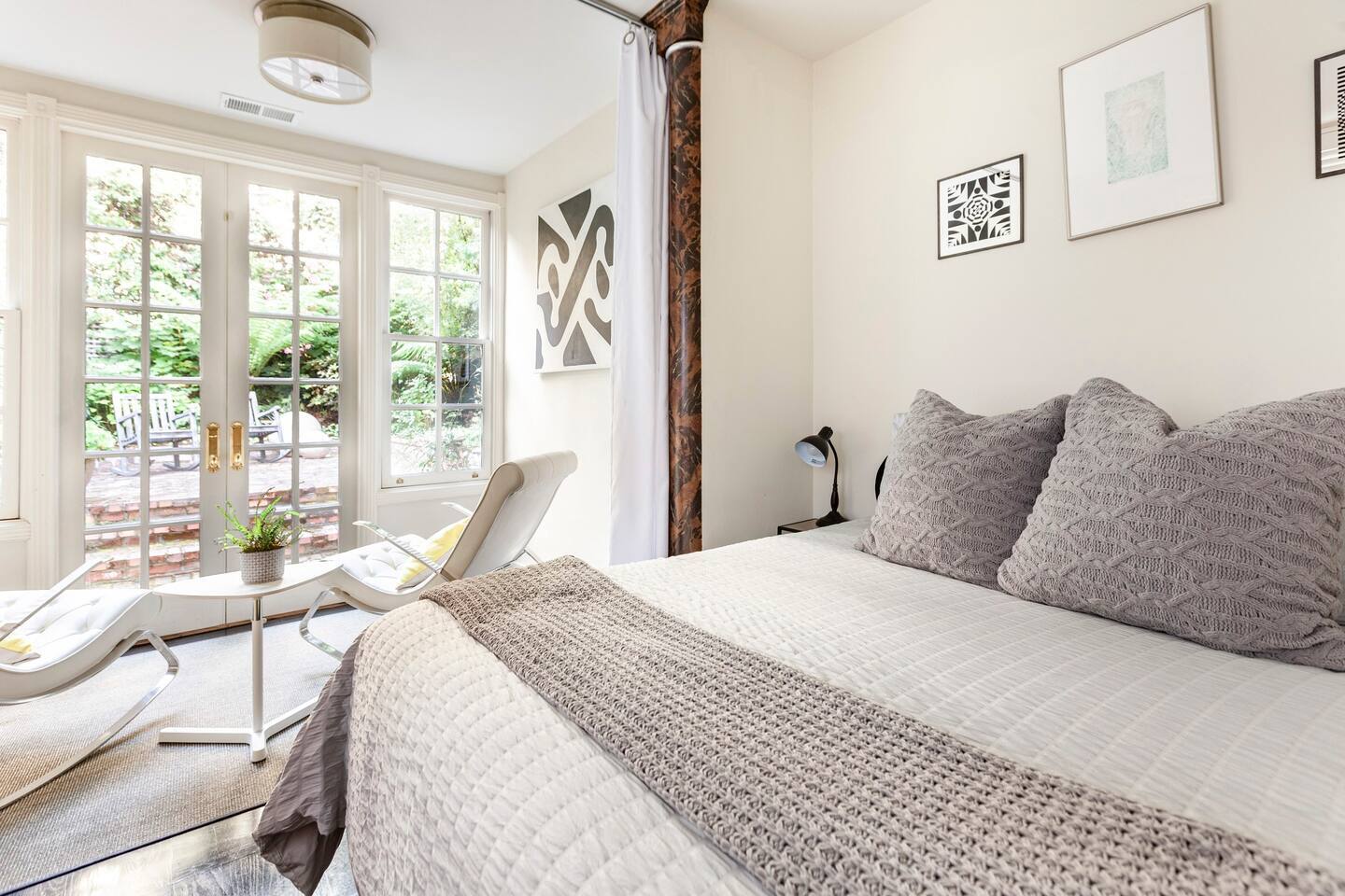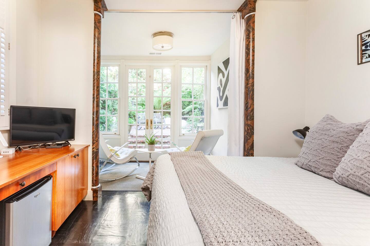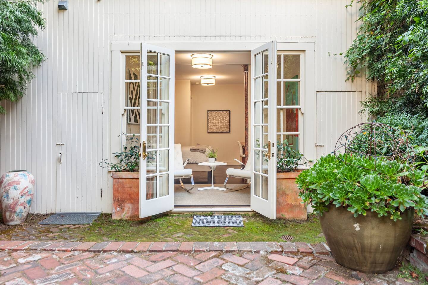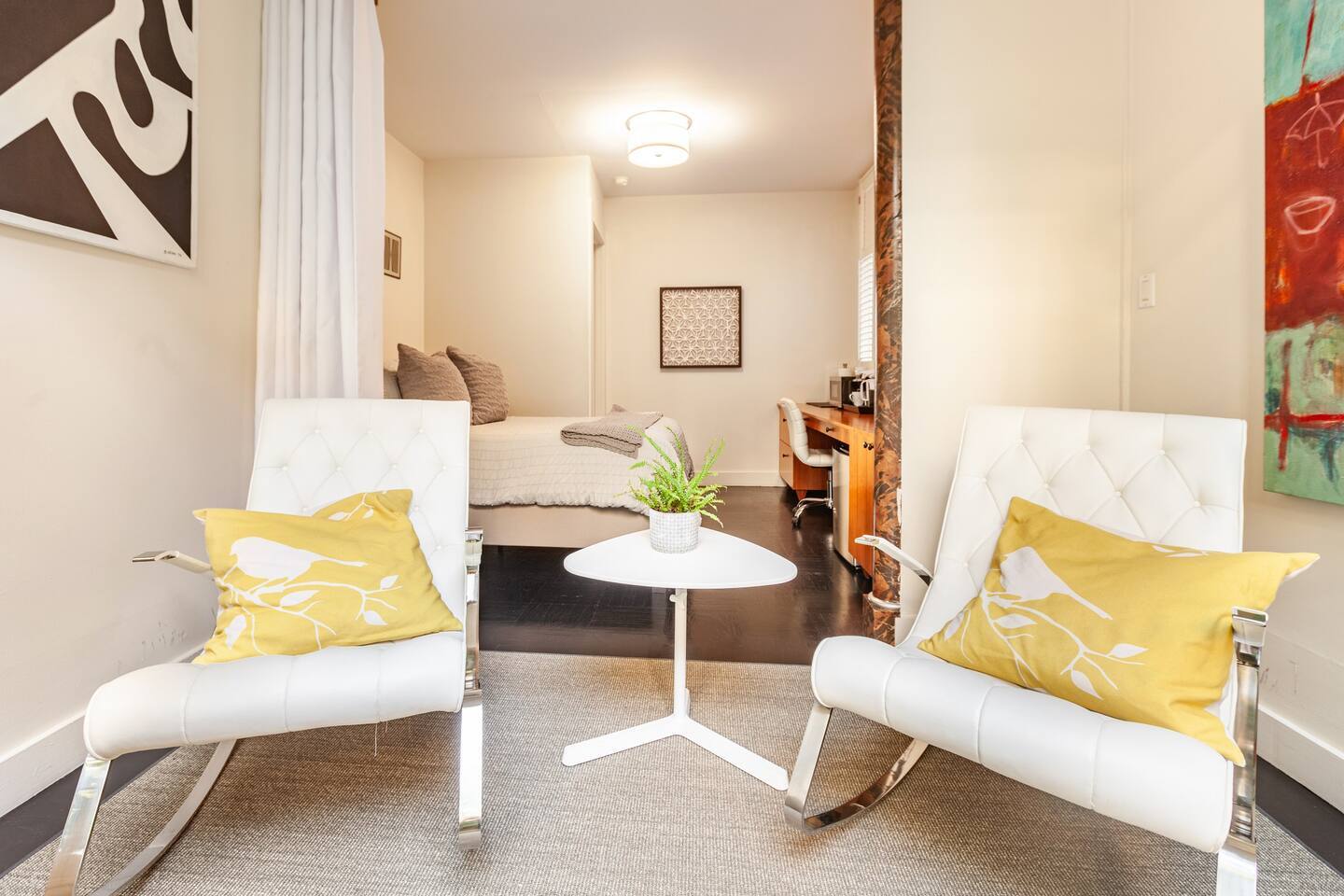 Chill out on a modern rocking chair gazing out onto a rare San Francisco backyard oasis. Look for butterflies, dragon flies, and humming birds while listening to the water fountain. Queen bed, full wall length work desk and Large private bathroom.