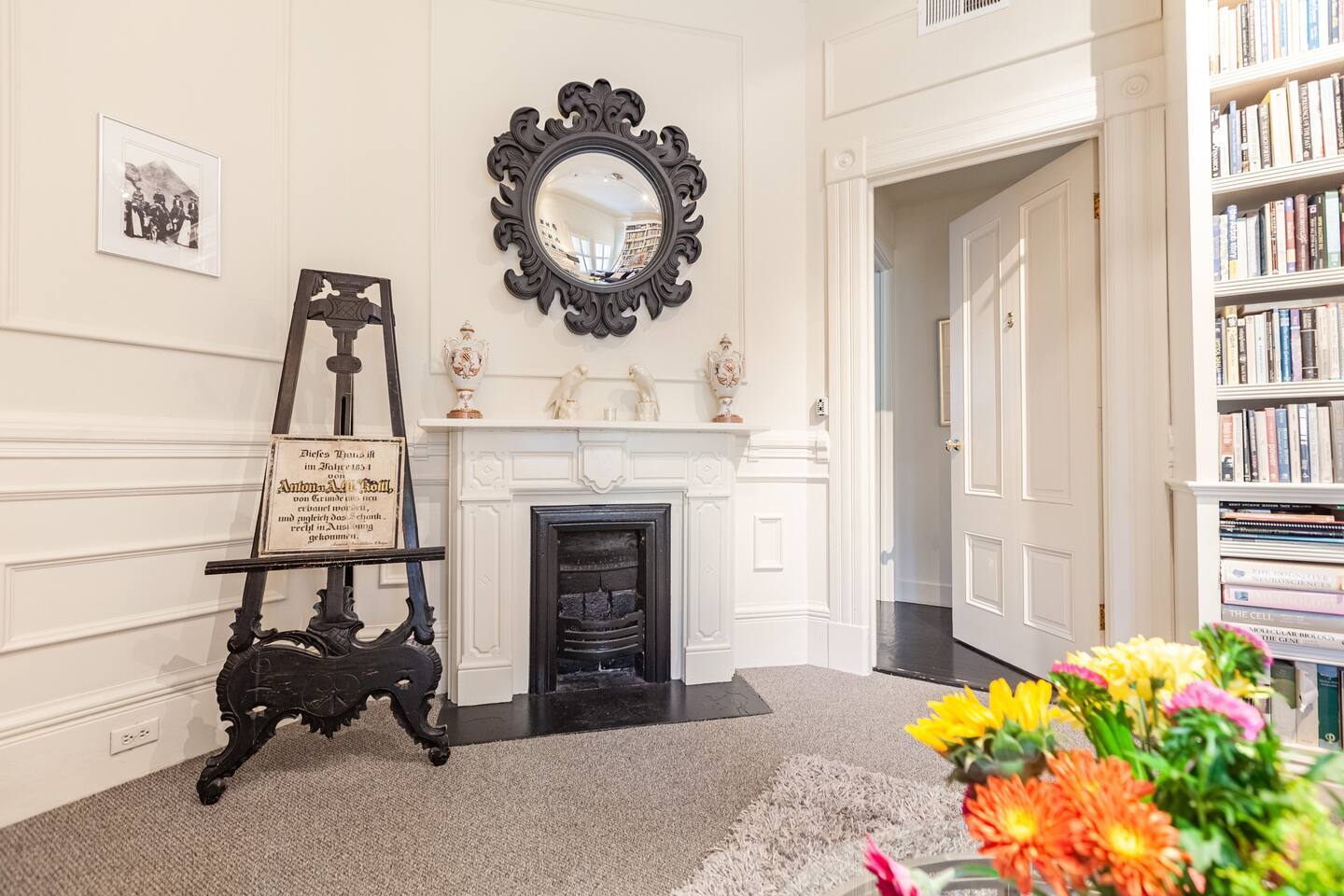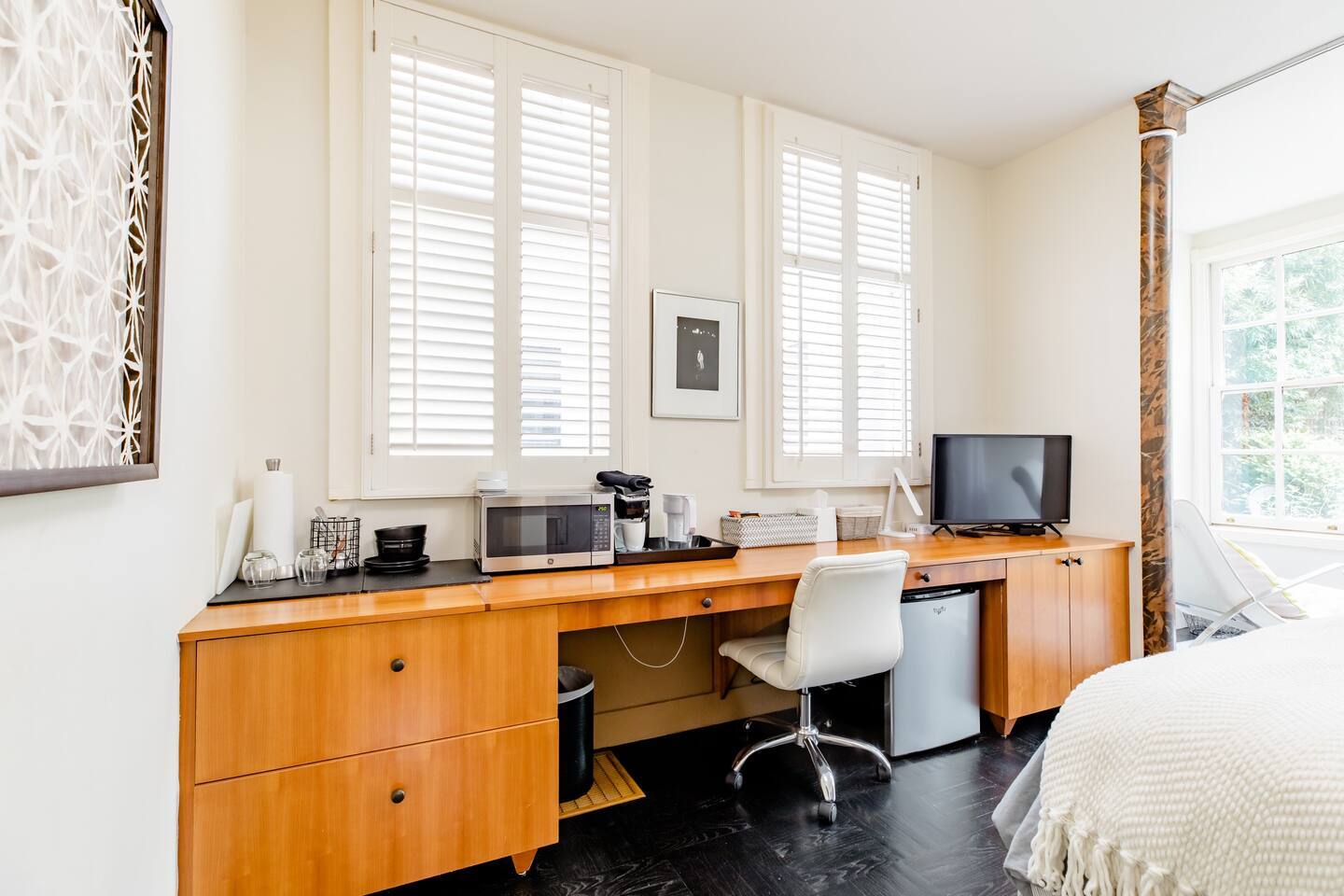Second floor of the Grand Victorian, you will find the garden bedroom & bathroom suite just past the library. This is a quiet and serene space Comfortable Queen bed, a custom-built-in desk. TV, Keurig, mini refrigerator, microwave. Large sunny private bathroom with roomy mirrored closet doors. Very enjoyable space!